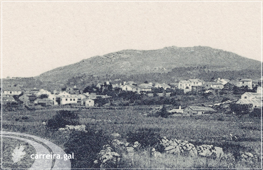 Ó fondo podemos apreciar totalmente pelado o Monte da Cidá visto dende o lugar de Listres. Circa 1920.
