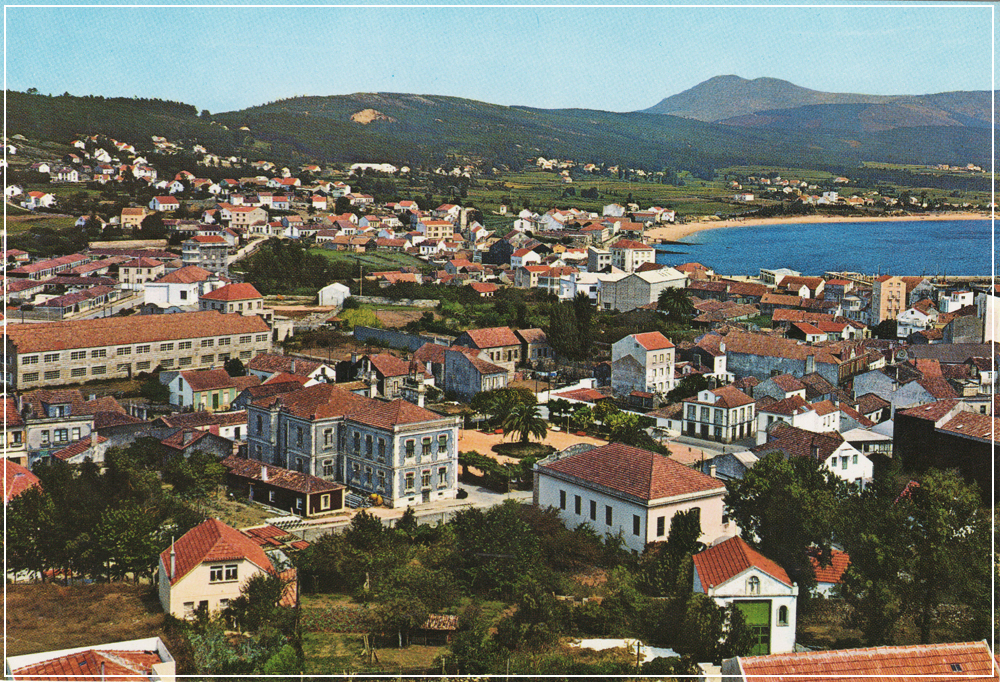 Imaxe do centro urbano de Ribeira, ca vella Casa Consistorial en primeiro termo, por enriba, a súa esquerda, o edificio grande de talleres Nervión, contruido con moita pedra extraída do monte da Cidá. Imaxe do ano 1969.