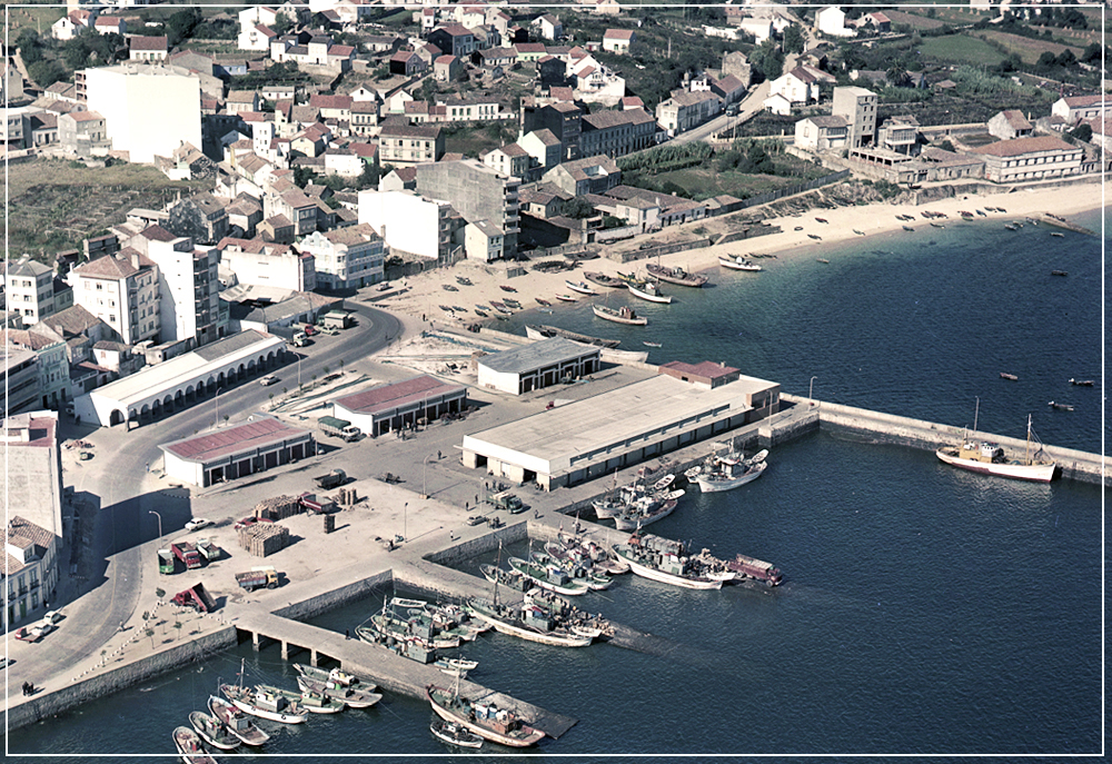 O peirao de Ribeira, amosando á esquerda en primeiro termo unha parte da fábrica de Martínez, e máis o taller El Nervión. Un pouco máis á dereita, a nova lonxa, cas ramplas na súa fronte, e as chabolas que se estaban a construir. Imaxe do ano 1966.