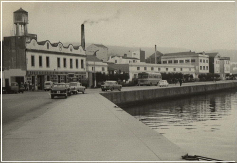 Unha vista do malecón de Ribeira, feito no ano 1952, cas fábricas de Cardona, Martínez (o Abadiño) e talleres Nervión en primeiro termo, nunha imaxe de mediados dos anos 60.