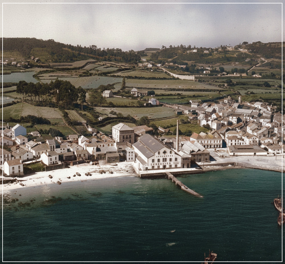 Vista aérea do lugar de Bandaorrío, ca fábrica de Conservas Cerqueira en primeiro termo. Imaxe de finais dos anos 60.