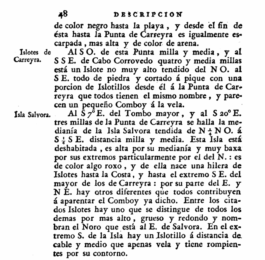 “Islotes de Carreyra. Al SO. de esta Punta milla y media, y al SSE. de Cavo Corrobedo quatro y media millas está un Islote no muy alto tendido del NO. al SE. todo de piedra y cortado á pique con una porción de Islotillos desde él a la Punta de Carreyra que todos tienen el mismo nombre, y parecen un pequeño Comboy a vela.“