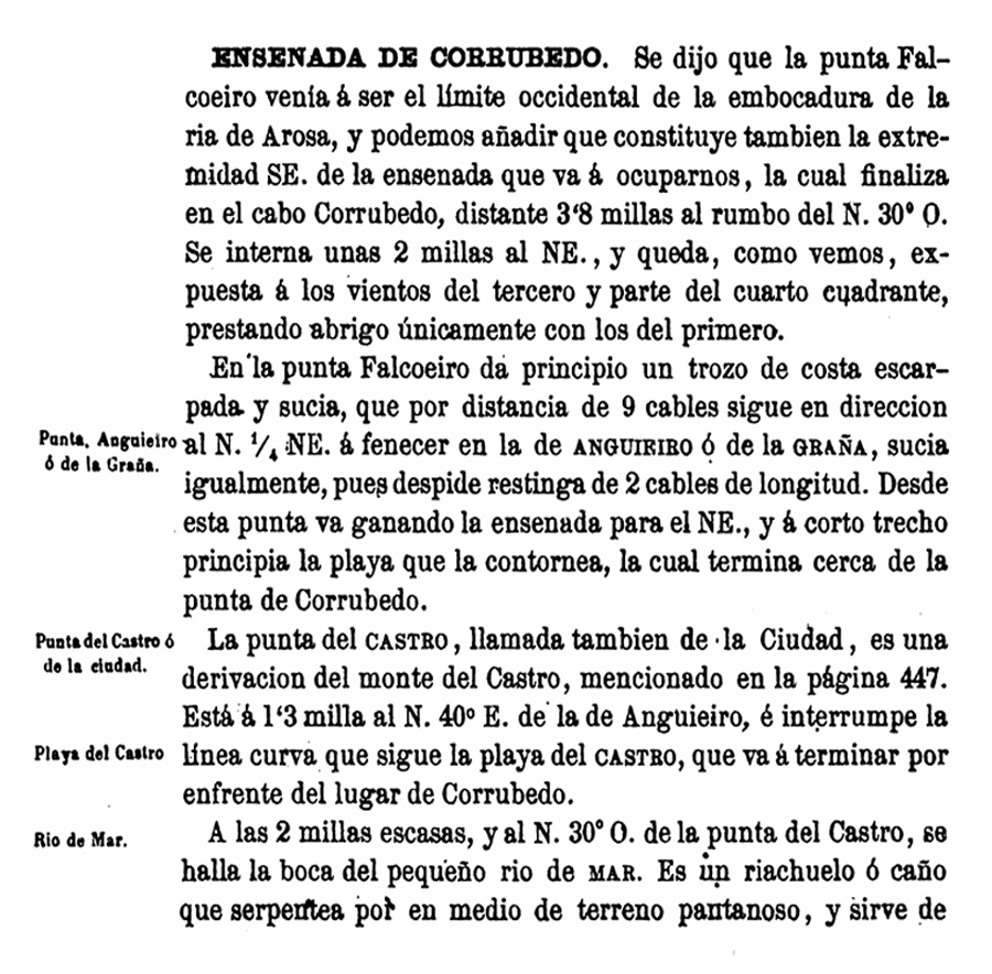 “La punta del Castro, llamada también de la Ciudad, es una derivación del monte del Castro, mencionado en la página 447. Está a 1’3 milla 40º E de la de Anguieiro, e interrumpe la línea curva que sigue la playa del Castro, que va a terminar por enfrente del lugar de Corrubedo“.