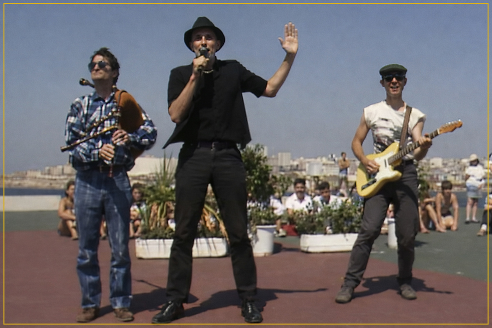 Alberto Torrado, Antón Reixa, e Rubén Losada, Os Resentidos, nunha actuación en directo para a TVG na praia de Riazor, na Coruña. Ano 1987.